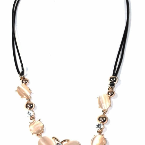 Sparkles of white crystal accents, golden shiny beads and light oval faux stones dazzle throughout the regal black chord closure in this necklace. Center pieced are a trio of fluttering butterflies encrusted in shiny and elegant light pink acrylic stones, an absolute favorite of Wild Lotus and pairs especially beautiful with lace and other classic looks.